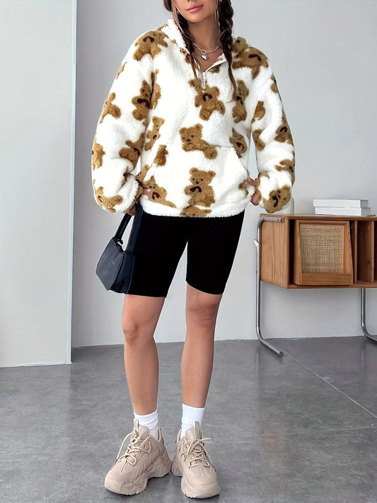 Damen Herbst Langarm-Plüschoberteil mit Bärendruck und lockerer Passform