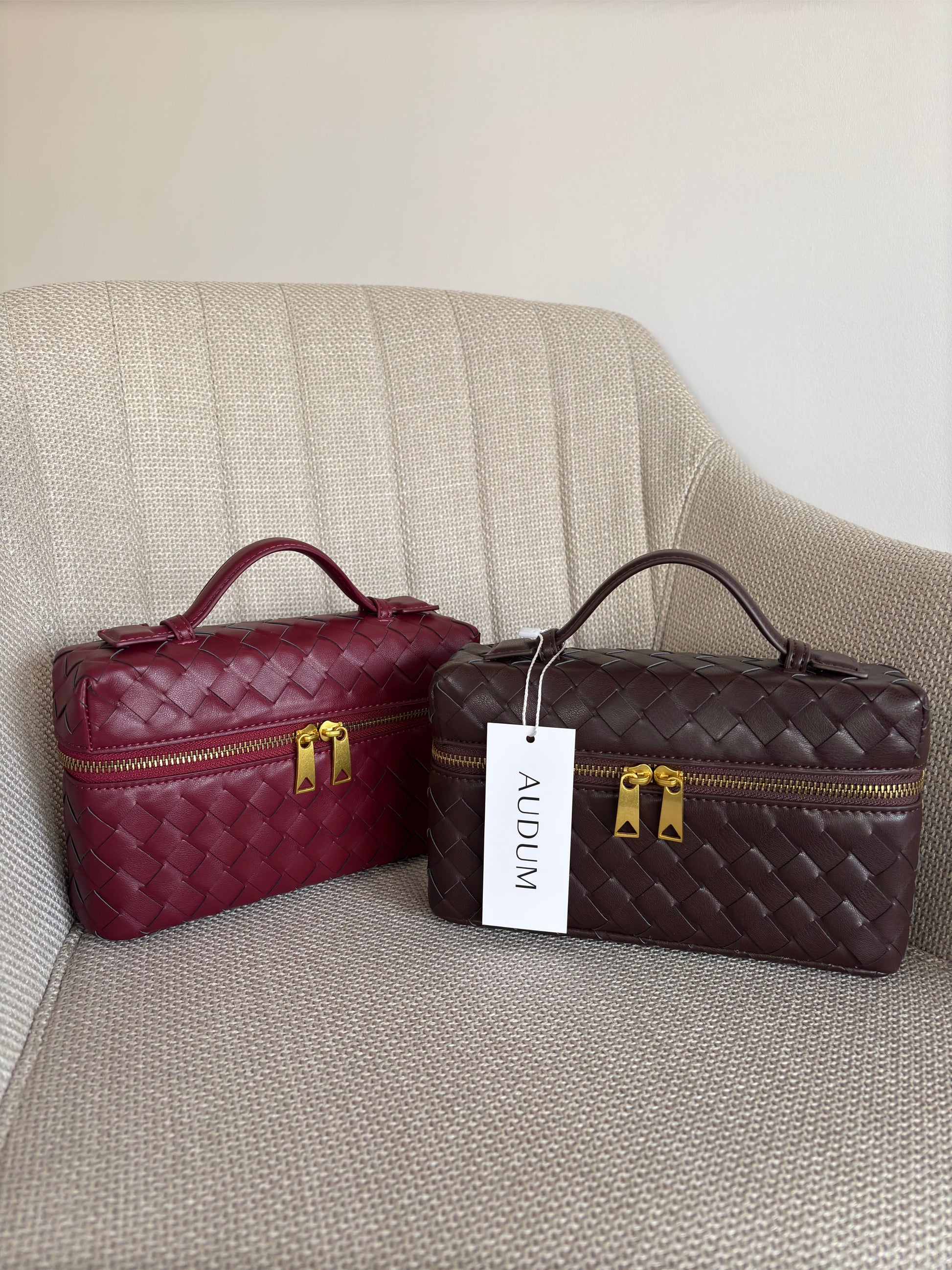 Die Aria Woven Bag vereint Eleganz und Funktionalität mit einem Tragegriff, goldfarbenen Metalldetails und einem Fach für Ihre wichtigsten Utensilien.