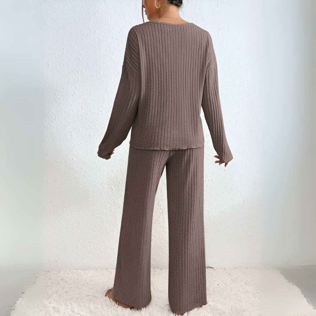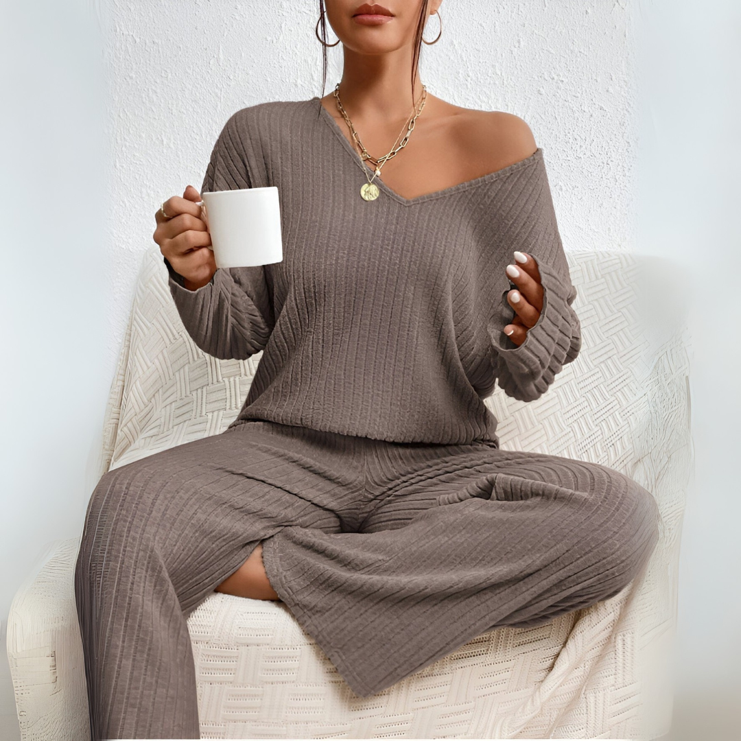 Dieses gerippte zweiteilige Set kombiniert ein elegantes Design mit einer bequemen Passform und ist somit perfekt zum Entspannen zu Hause oder zum stilvollen Ausgehen. Der Pullover mit V-Ausschnitt verleiht einen Hauch von Eleganz, während die passende Hose ganztägigen Komfort gewährleistet.