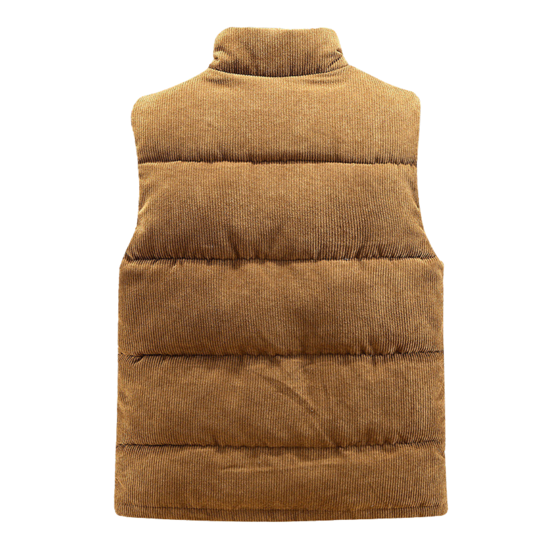 Diese Weste hat ein gestepptes Design mit einem strukturierten Stehkragen und einem sicheren Druckknopfverschluss. Das Material besitzt eine markante texturierte Oberfläche, die das Erscheinungsbild verstärkt. Zwei seitliche Taschen sorgen für Funktionalität, während das gesamte Design eine klare und strukturierte Form bietet.