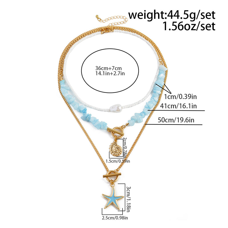 Die Halskette Maris vereint drei Lagen in einem stilvollen Design: weiße Perlen mit einer Muscheloptik, türkisfarbene Steine sowie goldene Anhänger in Form von Sonne und Seestern. Dieses Schmuckstück bringt sofort Urlaubsstimmung und einen maritimen Charme in Ihr Outfit. Ideal für den Sommer, Strandtage oder als besonderer Akzent zu schlichten Looks.