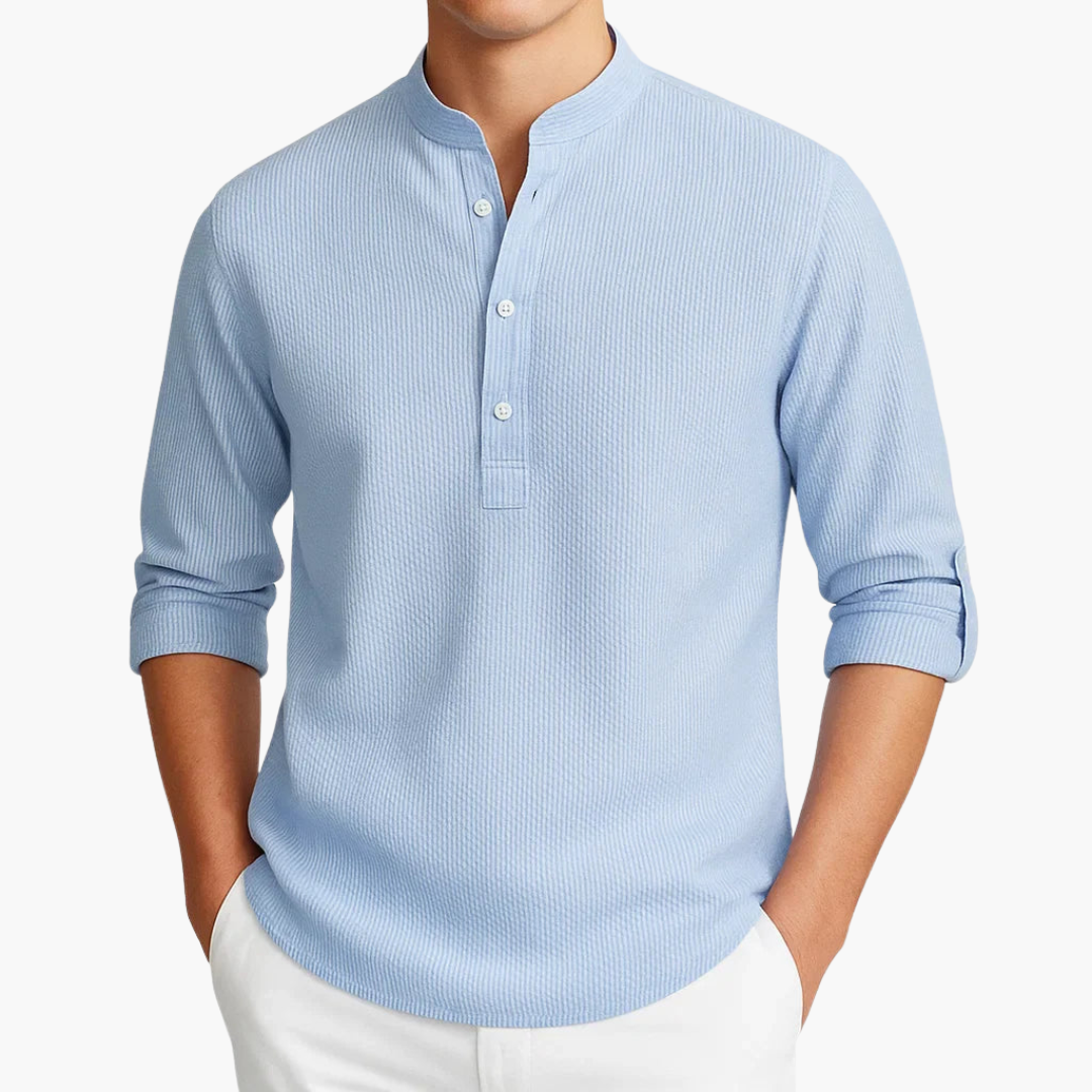 Dieses Herren Langarmshirt mit Stehkragen besteht aus einer leichten Baumwollmischung mit veganer Funktionsfaser. Es ist für Frühling und Sommer geeignet. Zu den Merkmalen gehören lange Ärmel, ein 3-Knopf-Leistenkragen, gerundeter Saum und gerippte Struktur. Ideal für den Alltag, Büro oder legere Anlässe bei warmem Wetter.